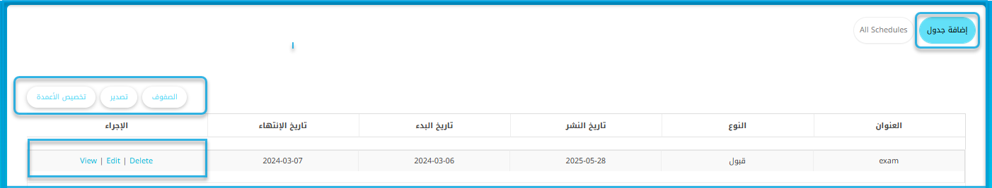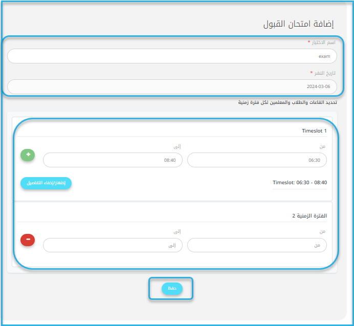 • إمكانية إنشاء جدول لاختبارات القبول من خلال واجهة المسؤول