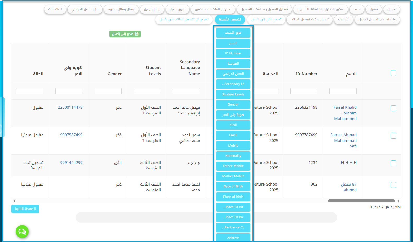 1. في الشاشة الرئيسية لتسجيل الطلاب، انقر على زر تخصيص الأعمدة أعلى جدول الطلاب.