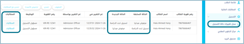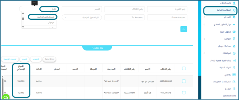 إنشاء تقارير موافقات التسجيل والمطالبات المالية الهدفكمحاسب، أريد: الوصول إلى تقرير واحد ضمن قائمة الحسابات يعرض المطالبات المالية للطلاب النشطين والطلاب المنتظرين للقبول، لتوفير الوقت وتجنب التبديل بين تقارير متعددة. مسار الوصول:• يسجل المحاسب الدخول ويتجه إلى قائمة الحسابات. • من الشريط الجانبي، يختار "المطالبات المالية".• يعرض النظام صفحة التقرير مع عوامل التصفية الافتراضية (مثل الفصل الدراسي الحالي، والحالة "نشط، انتظار القبول، إلخ") والتي ستطبق على جميع مطالبات الطلاب. • كما ستجد ضمن علامة تبويب "التسجيل "سجلات تغيير حالة التسجيل" التي تعكس التغييرات على حالة الطالب من قبل مسئول التسجيل، مثل الانتقال من "انتظار القبول" إلى "مرفوض" وما إلى ذلك. كيفية الاستخدام:كيفية الاستخدام• يمكن للمحاسبين تصفية التقرير حسب نطاق التاريخ (تاريخ التسجيل أو المطالبة)، المدرسة(المدارس)، الفصل الدراسي، مستوى الطالب، حالة التسجيل، حالة الدفع، نوع الفاتورة، عنوان القسم، عنوان المستوى، عنوان المرحلة، واسم الطالب أو رقم الهوية • يمكن للمستخدمين تصدير التقرير بتنسيقات إكسل وPDF. • يجب أن يدعم التقرير ترقيم الصفحات والترتيب في جميع الأعمدة.