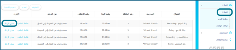 - • حساب مدير النظام -- القائمة الجانبية -- تتبع الحافلات -- الرحلات -- المزيد من الإجراءات لأي رحلة -- سجل الرحلة -- سجل الطلاب.