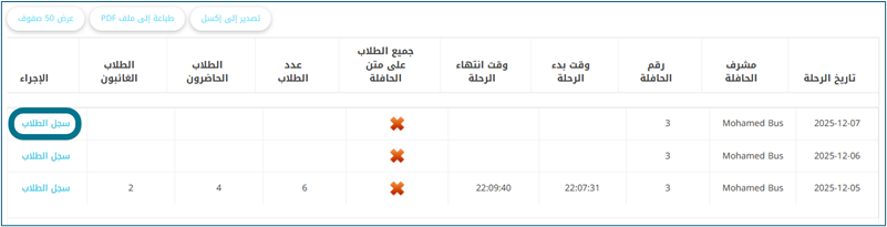 - حساب مشرف الحافلة -- الصفحة الرئيسية -- إجراءات لأي رحلة -- سجل الرحلة -- سجل الطلاب.