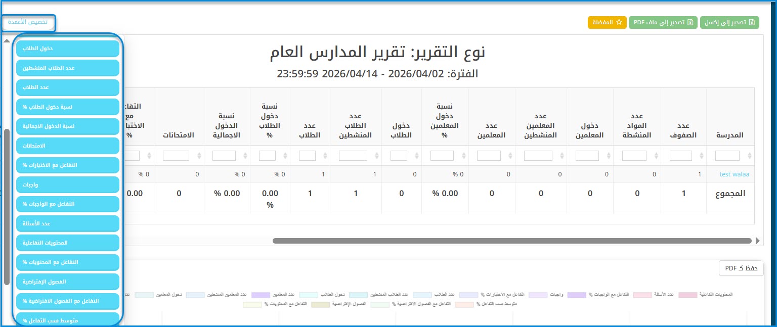 في هذه المرحلة، خيارات التصدير إلى Excel و PDF ستظهر فقط الطلاب الموجودين في الصفحة الحالية المُرقَّمة.