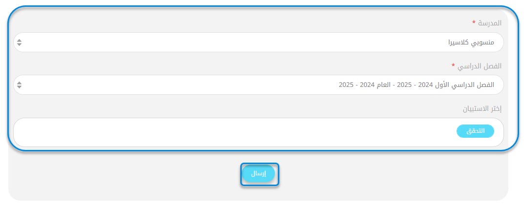 2. • اسم المدرسة : سيعرض قائمة بالمدارس التي يمتلك المستخدم صلاحية الوصول إليها.