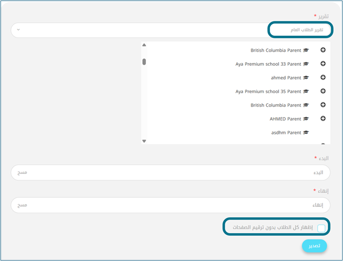 • ستظهر خيار "إظهار كل الطلاب بدون ترقيم الصفحات" عند النقر عليه، ستظهر جميع أسماء الطلاب في المدرسة بدون ترقيم للصفحات والعكس صحيح.