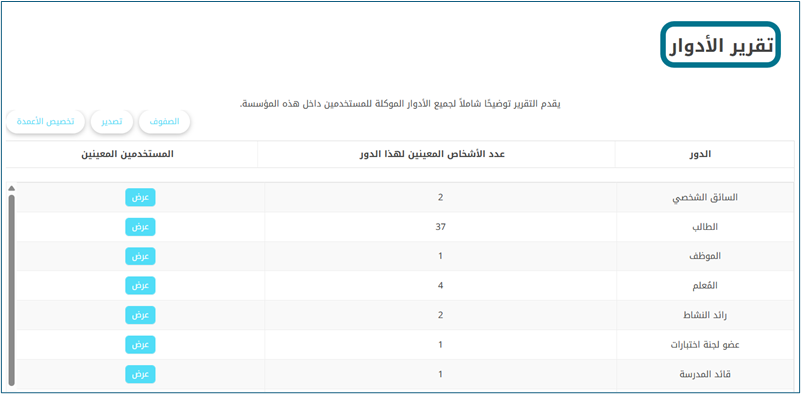 : كمدير نظام، أريد الحصول على تقرير جديد يجمع أعداد جميع الأدوار في مدرستي، بحيث يمكنك العثور في قسم "المستخدمين" على تقرير باسم "تقرير الأدوار"، يتضمن الأعمدة التالية: