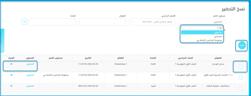 أضف "تاريخ النشر" لتحضير المادة. وحدد مربع الاختيار بجوار المواد والصفوف التي سيتم نشر هذا التحضير لها.