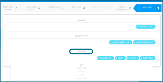 الهدف: كمشرف للاختبارات، أرغب في ربط الاختبار المركزي بعدة قوالب مواد بناء على فئة المادة المحددة، لكي أتمكن من تصفية الأسئلة والإحصائيات داخل نفس الاختبار حسب فئة المادة، والمجال، والمعيار