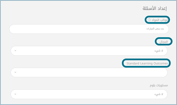 • سيتم عرض الأسئلة التي تطابق فئة المقرر + المجال + المعيار المحددين فقط في بنك أسئلة الاختبار وفي إحصائياته.