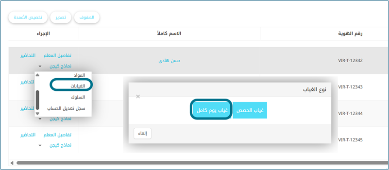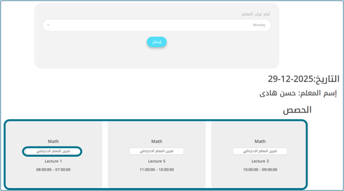 - المدير/قائد المدرسة -- القائمة الجانبية -- المعلمون -- المزيد من الإجراءات لأي معلم -- الغياب -- غياب اليوم الكامل-- & "تعيين معلم بديل لكل حصة".