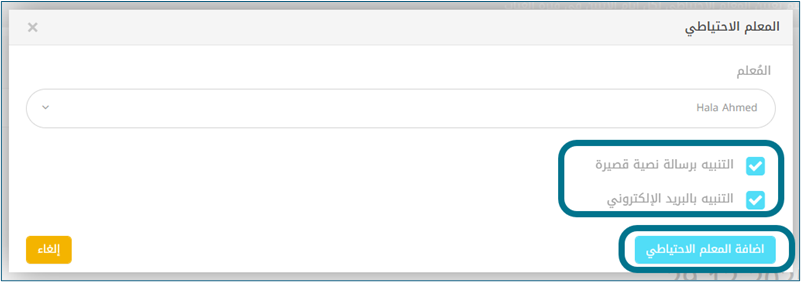 - يمكن للمدير/قائد المدرسة أن يقرر ما إذا كان يرغب في إشعار المعلم البديل عبر البريد الإلكتروني أو الرسائل القصيرة (SMS).