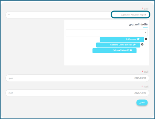 - 1. يفتح المستخدم "تقرير تفعيل المشرفين" من القائمة الجانبية للتقارير، ثم "التقارير الإدارية"، ثم يختار التقرير الأخير.