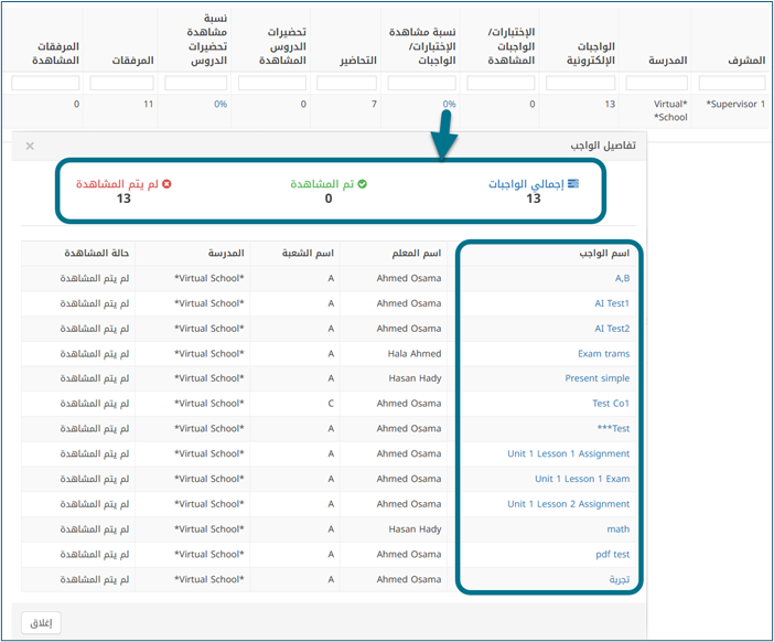 - • عرض مدير النظام: يُظهر التقرير الفرعي اسم المعلم واسم الشعبة، ولكن دون روابط قابلة للنقر للمرفقات.