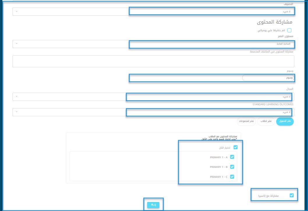 - حدد ما إذا كنت تريد نشر هذا المحتوى لجميع الفصول أم لطلاب محددين من تبويب نشر لطلاب.