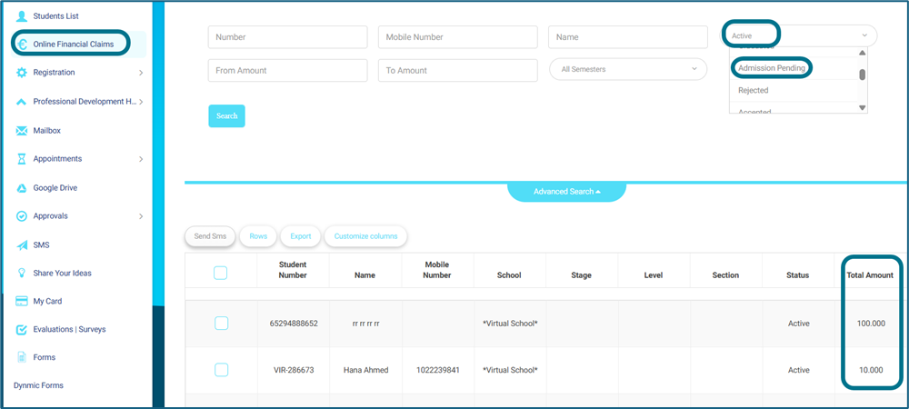 Access a single report under the Account menu that shows financial claims for active students & who’s pending admission, to save time and avoid switching between multiple reports.