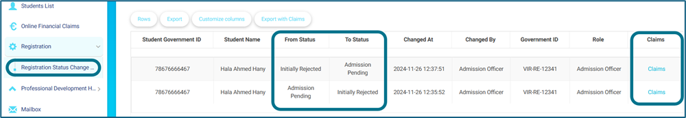 • Also, you will find under Registration tab “Registration Status Change Logs” which reflect changes on student’s status from Registration officer Such as from Admission Pending to Rejected and so on….