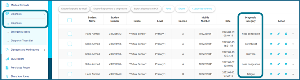 •On the diagnoses page, clinic officer will be able to filter using the diagnosis category and to view the medical record.