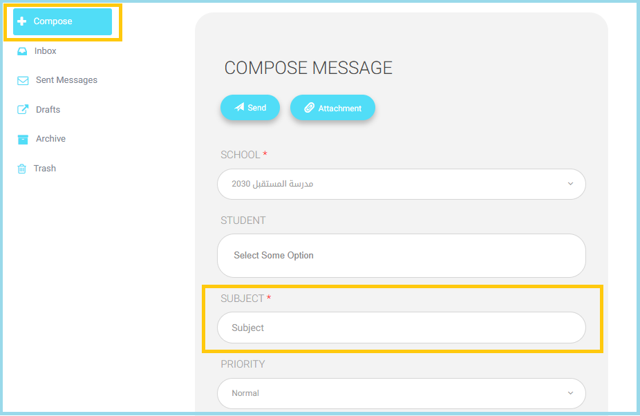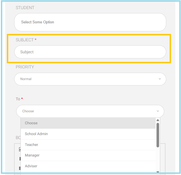 - Enter the Subject related to the teacher to whom the message will be sent (mandatory).