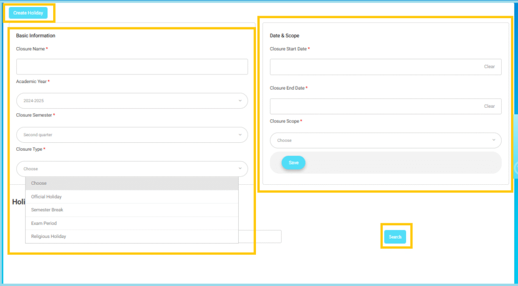 • Closure Scope *: Choose which areas/modules will be impacted by this holiday (example: attendance, schedule, etc., depending on system configuration).